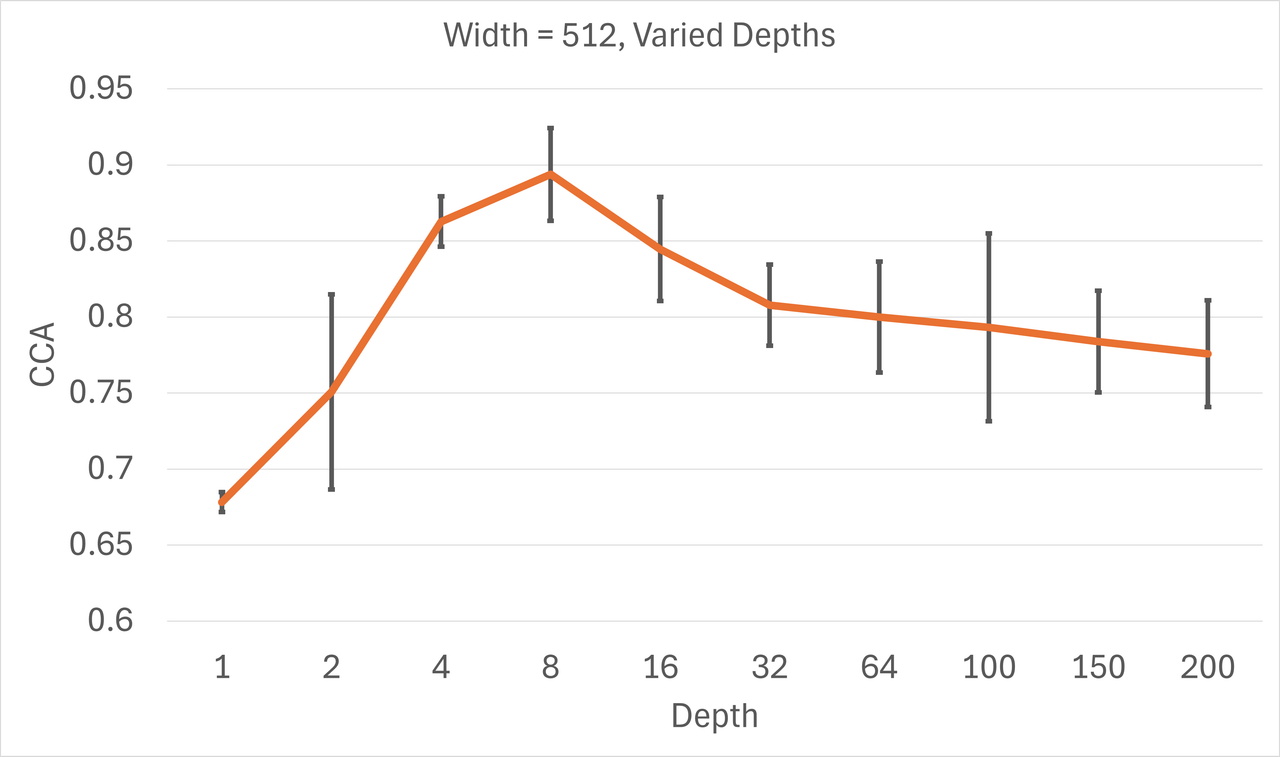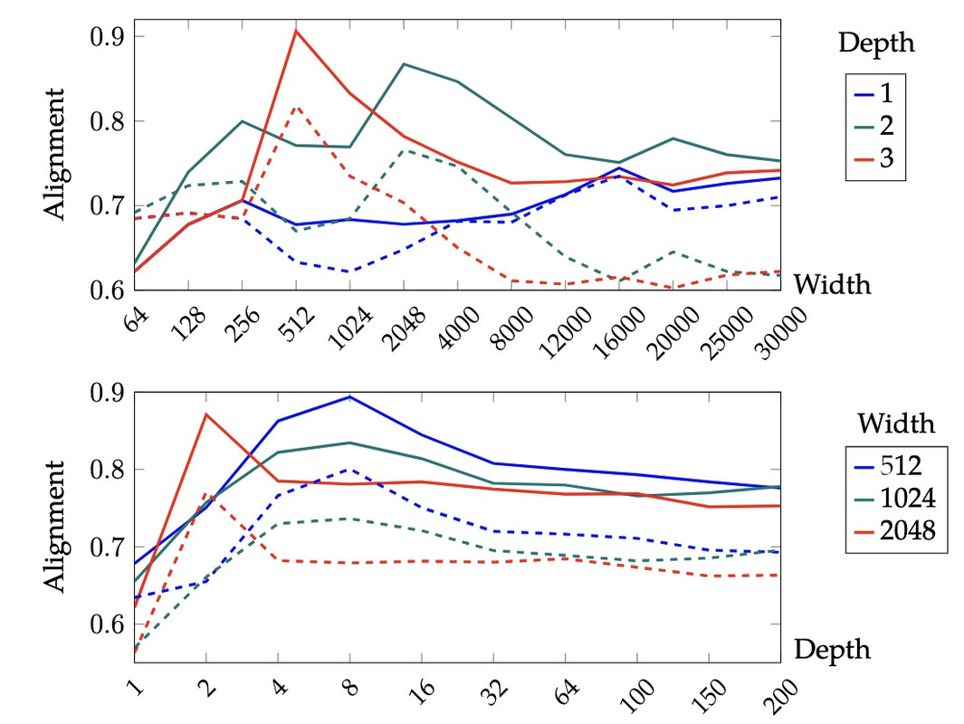 The main observation is that the alignment becomes much higher (CCA generally and can be ). Also, as the model becomes wider/deeper, the alignment first increases and then decreases. We interpret the results as follows: