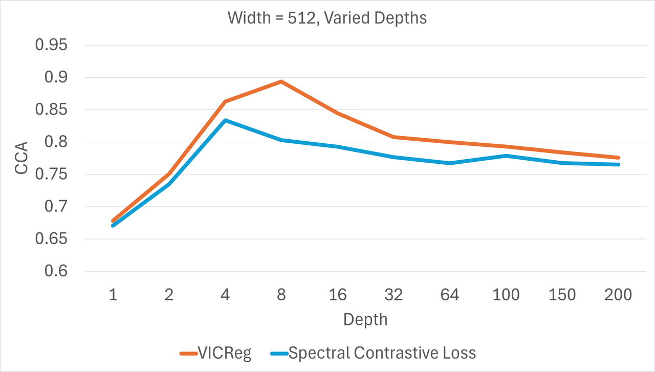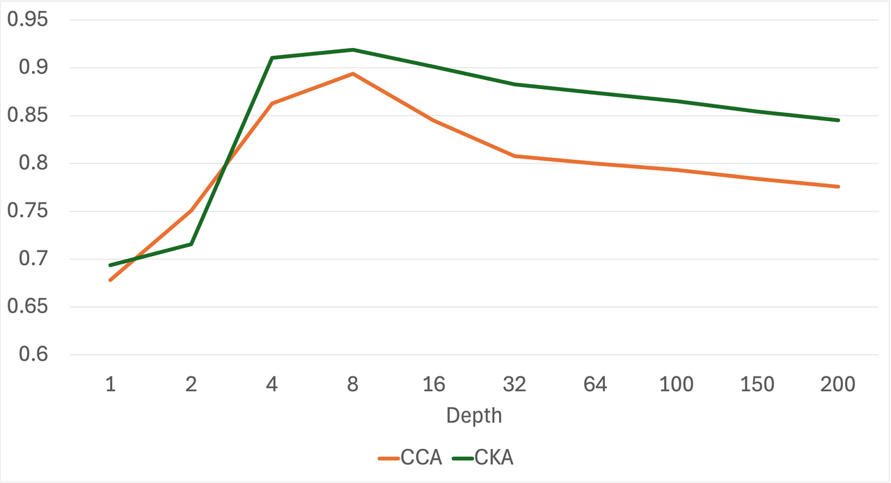 Moreover, CCA is equivalent to linear CKA if both representations are centered and whitened. We also evaluate the CKA when the representation is , that is each singular function is multiplied by the singular value. We run the experiment in Section 4.2 with a fixed width 512 and varied depths. The result is plotted at https://i.postimg.cc/Jzrbc00M/Picture1.png. The plot shows that the trends of CCA and CKA are very similar.