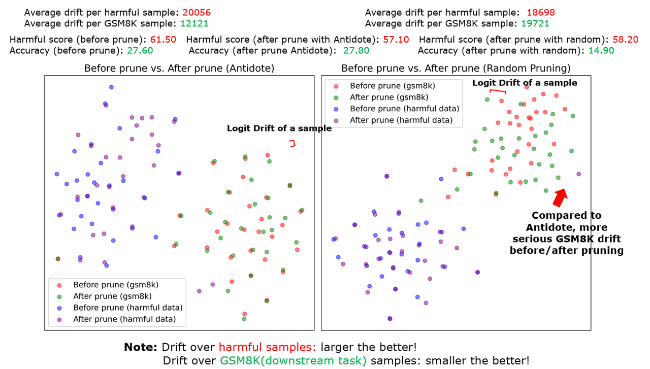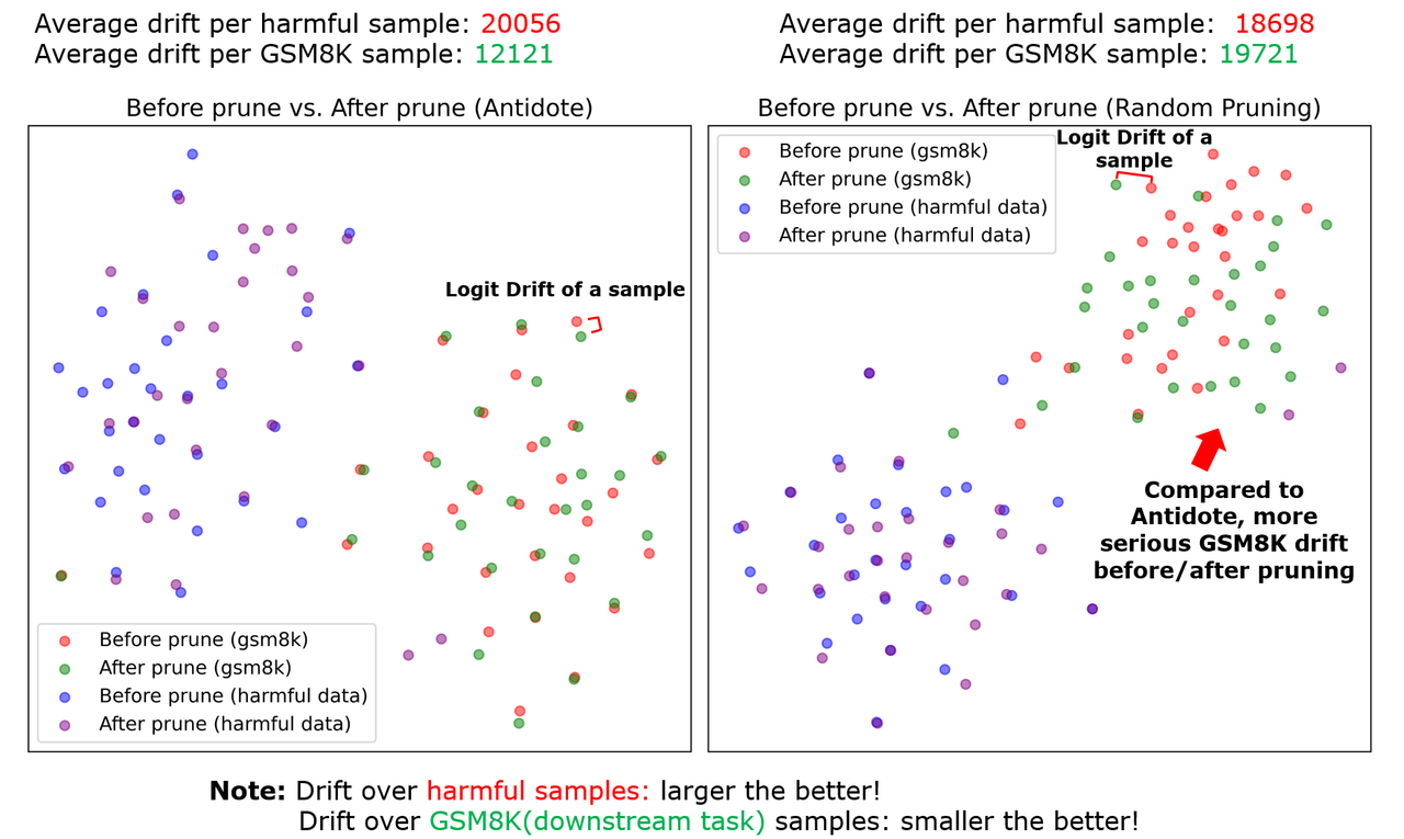 (Graph) In the graph (the link above), each dot represents the output logit of the model, given a harmful sample or a GSM8K sample as its input. For example, to generate a red point, we input a GSM8K sample into the before-prune model and extract its output. To generate a green point, we input the same GSM8K sample to the after-prune model. We iteratively do that for 30 random GSM8K samples and 30 random harmful samples and visualize them in the graph. By looking at the graph, you can have a rough idea that pruning with Antidote has a smaller drift on the output over GSM8K samples, compared to random pruning.