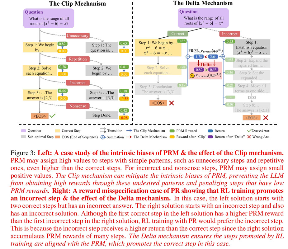 - We also agree that simply using PRM as dense rewards (PR) could be a wrong usage of the rewards. In our additional case studies, as shown in Fig. 3 (also available here), we identify the reward misspecification issue of PR. The proposed Delta mechanism can ensure the steps promoted by RL training are aligned with the PRM by optimizing single-step PRM rewards.