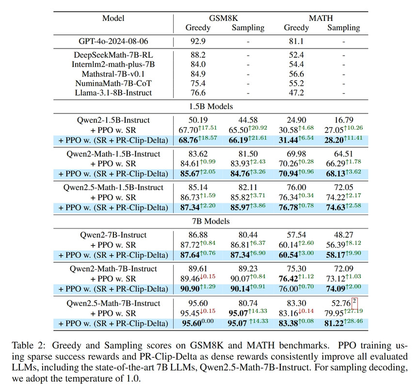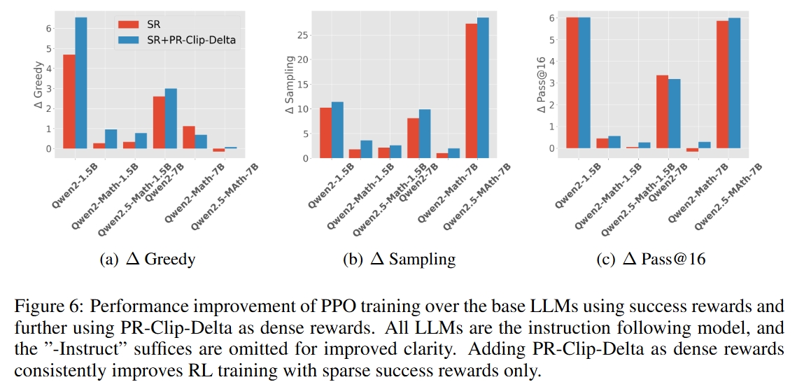 - We clarify that our experiments present a comparison between SR and SR+PR-Clip-Delta across all evaluated LLMs in Fig. 5 of Sec. 5(also available here), where using PR-Clip-Delta as dense rewards improves RL training with success rewards only across all evaluated LLMs. We also apologize for the misleading effect caused by the absence of training results of PPO w. SR in the main table (Table 2). We have updated Table. 2 (also available here) to explicitly include RL training results using success rewards for greater clarity.