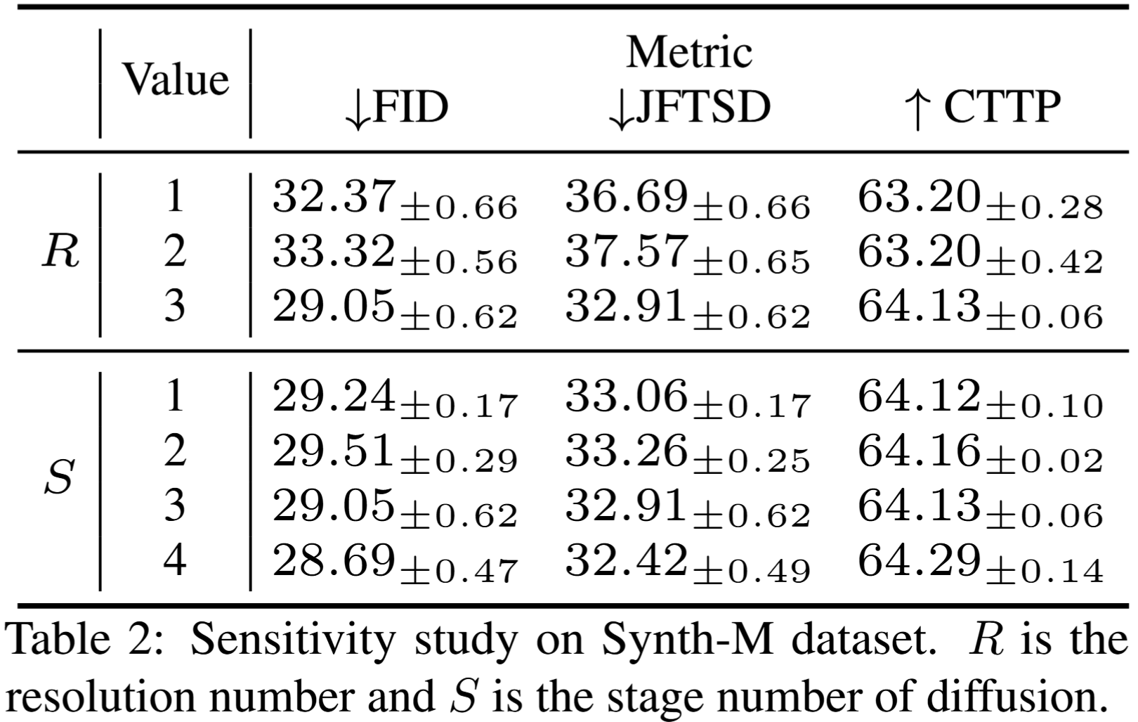 Thanks for comment. We added sensitivity study on Synth-M dataset to evaluate the impact of the multi-resolution number and diffusion stage number , with results shown in https://files.catbox.moe/n6v94k.png. It suggests that, beyond certain threshold, the benefits of multi-resolution and multi-stage modeling become apparent. We plan to extend this analysis to more datasets and revise the paper accordingly.