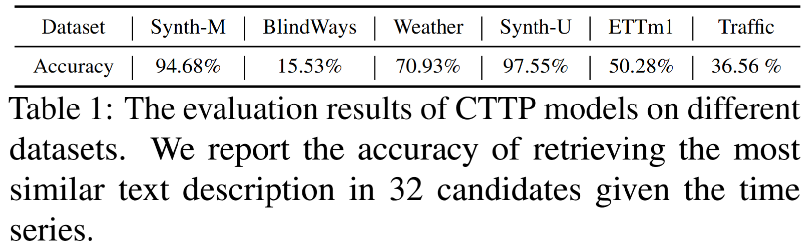 Thanks for suggestion! We recognize the importance of metric reliability. Following contrastive learning practices [1], we evaluate CTTP model using a retrieval-based protocol. For each time series in a random batch (B=32), we compute top-1 accuracy of retrieving its paired text from B candidates. Results (https://files.catbox.moe/zf1a6s.png) show effective semantic alignment ablity of CTTP model. We’ll include this in the revised paper.