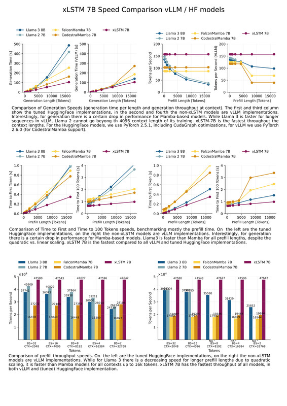 We observe a speed-up of Llama 3 for longer context lengths, also small speed-ups of Mamba-based models compared to our optimized HuggingFace versions. However, xLSTM 7B is still the fastest model (even when compared to baselines from optimized frameworks like vLLM), both in generation and prefill, with larger margin towards longer contexts, due to the quadratic scaling of Transformers. See the results at: https://i.postimg.cc/1XcMCyQV/Rebuttal-Plots.jpg