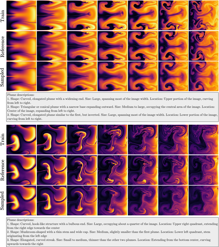The training set images are quite close to the generated samples, which in this case seems to be a limitation of the given dataset (from a separate paper) and the captioning process. The validation samples themselves are quite similar to the training set, and using an LLM to caption the two data splits could also result in similarities in the captions as well. However, we can notice that the solutions do diverge over time, and eventually reach noticeably different states. While the initial conditions are quite similar, small deviations eventually cause differences that the model would need to accurately model.