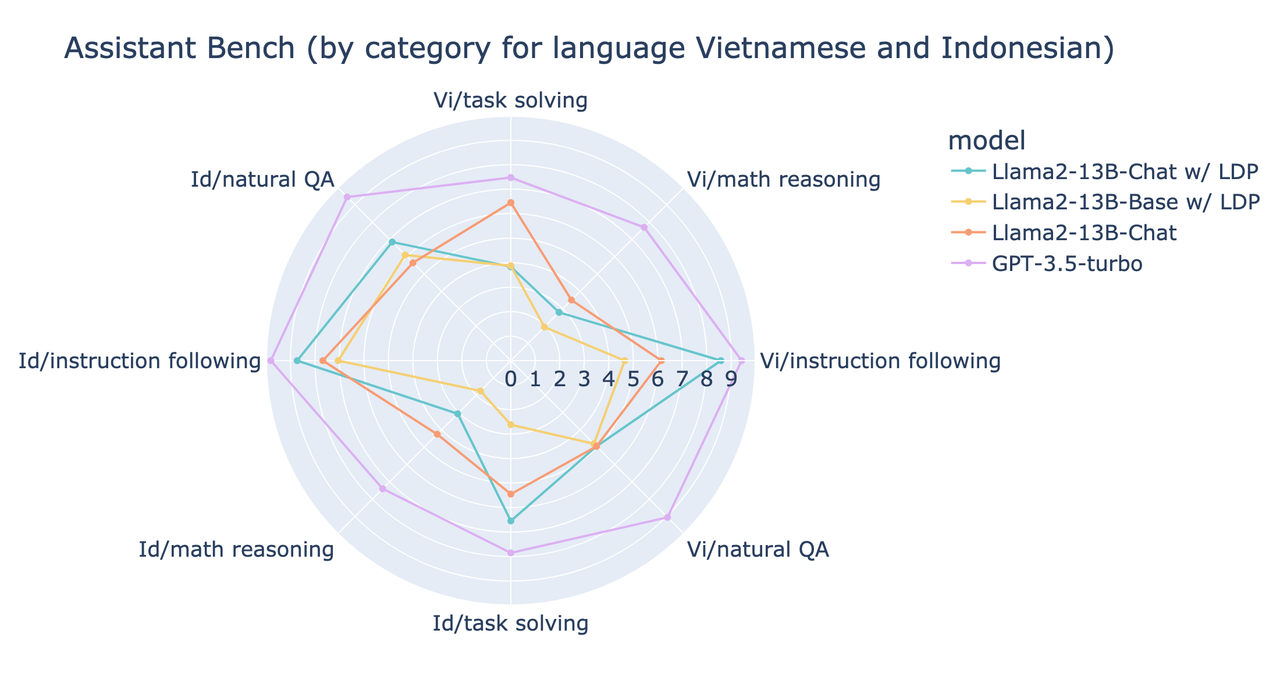 For this experiment, we obtain ~200 instructions across different task-types and categories (task solving, natural questions) and translate them into Vietnamese and Indonesian and test them with Llama-2 chat and base models. We use GPT-4 to evaluate the chat responses following MT-bench framework (Zheng, et al., 2023). We select 4 random instructions from En, Zh, Fr, Ru as LDP prompts.