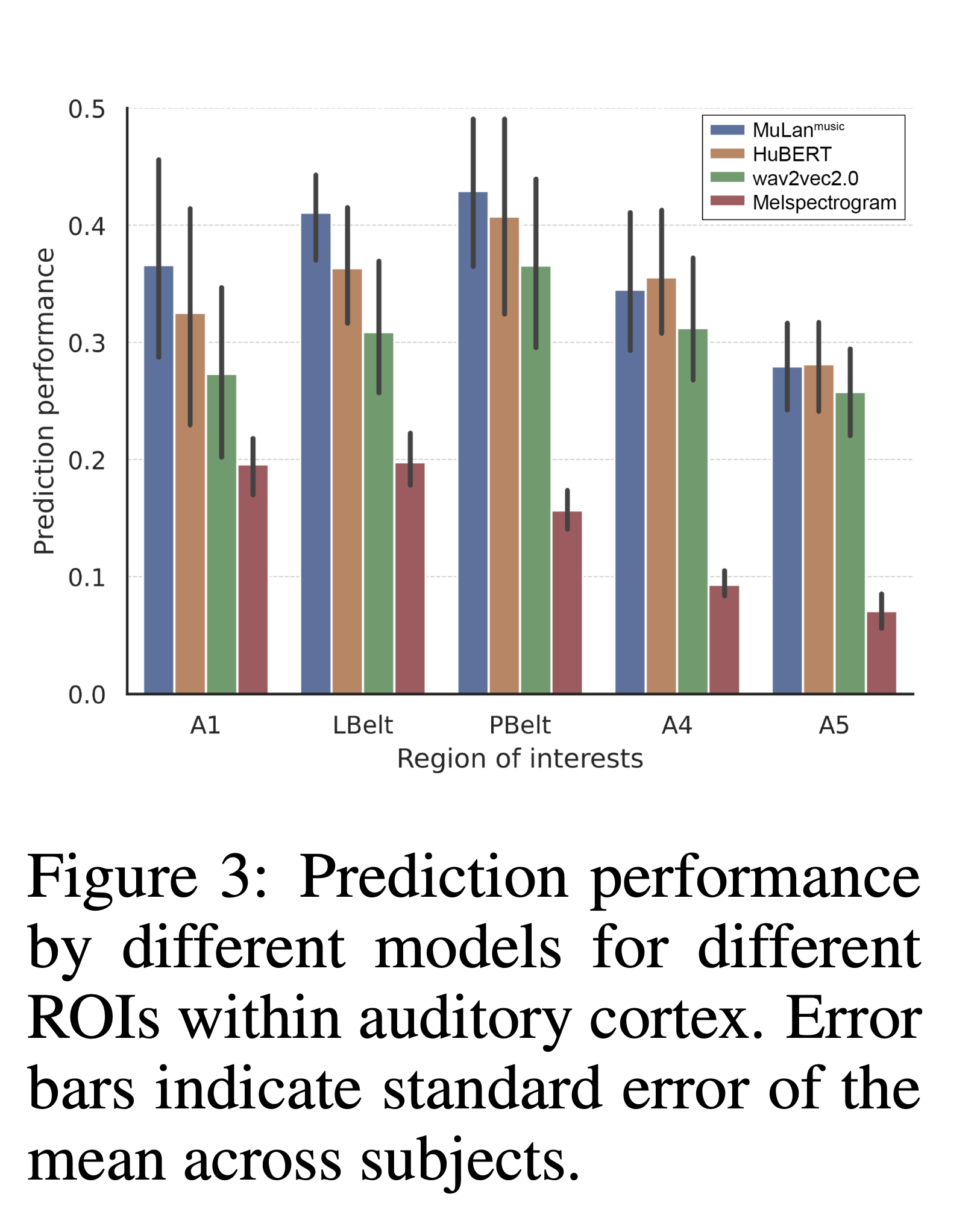 - However, strikingly, DNN features more accurately predicted the Lbelt/Pbelt regions (also known as A2/A3; early layers within the auditory hierarchy) than A1 (the earliest, primary auditory cortex), yet demonstrated lower performance in A4/A5 (association, higher auditory cortex). This trend has not been observed in other auditory neuroscience studies that focus on general sounds or speech, suggesting that it might be a phenomenon unique to music motivating further exploration.