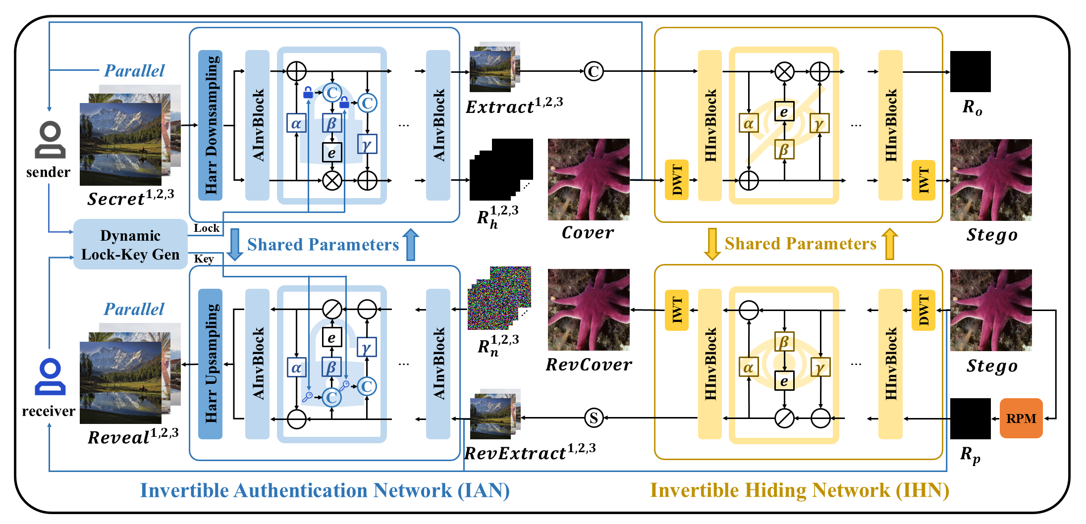 This work advances adaptive steganography by redefining secure multi-user communication through the integration of invertible networks and dynamic authentication. A key innovation lies in decoupling authentication from secret data via distribution adaptation, a conceptual leap that reimagines information hiding in constrained spaces. The parallel hiding architecture further exemplifies strong engineering intuition, achieving parameter reduction without compromising quality. Beyond its forward-looking contributions, the paper also addresses a pressing challenge in privacy-preserving multi-user steganography.