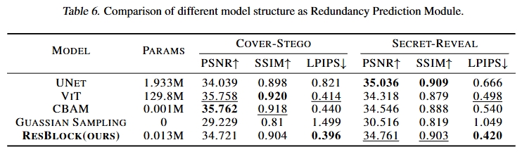 A3: RPM is employed to learn an auxiliary variable with consistent distribution to redundancy, which improves reversibility. Many traditional models of extracting features can achieve this. Residual structure has fewer parameters and can extract deeper features. Following your suggestion, we conduct experiments on structures of UNet, Vision Transformer(ViT), Convolutional Block Attention Module(CBAM) and traditional Gaussian sampling strategy (https://s1.imagehub.cc/images/2025/03/27/3c23350577d0befe5b36a40be11b2a32.jpeg). Compared to UNet and ViT, residual blocks achieve a balance between quality and model size. Compared to CBAM, residual blocks reveal secret images of higher quality. The above content will be added to the paper.