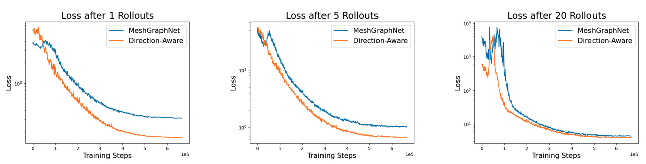- For both Figs. 3 and 4, I am not sure whether the worse performance of MeshGraphNet should be attributed to the network lacking the direction-aware message-passing mechanism or the decision to use the new loss function in MeshGraphNet.