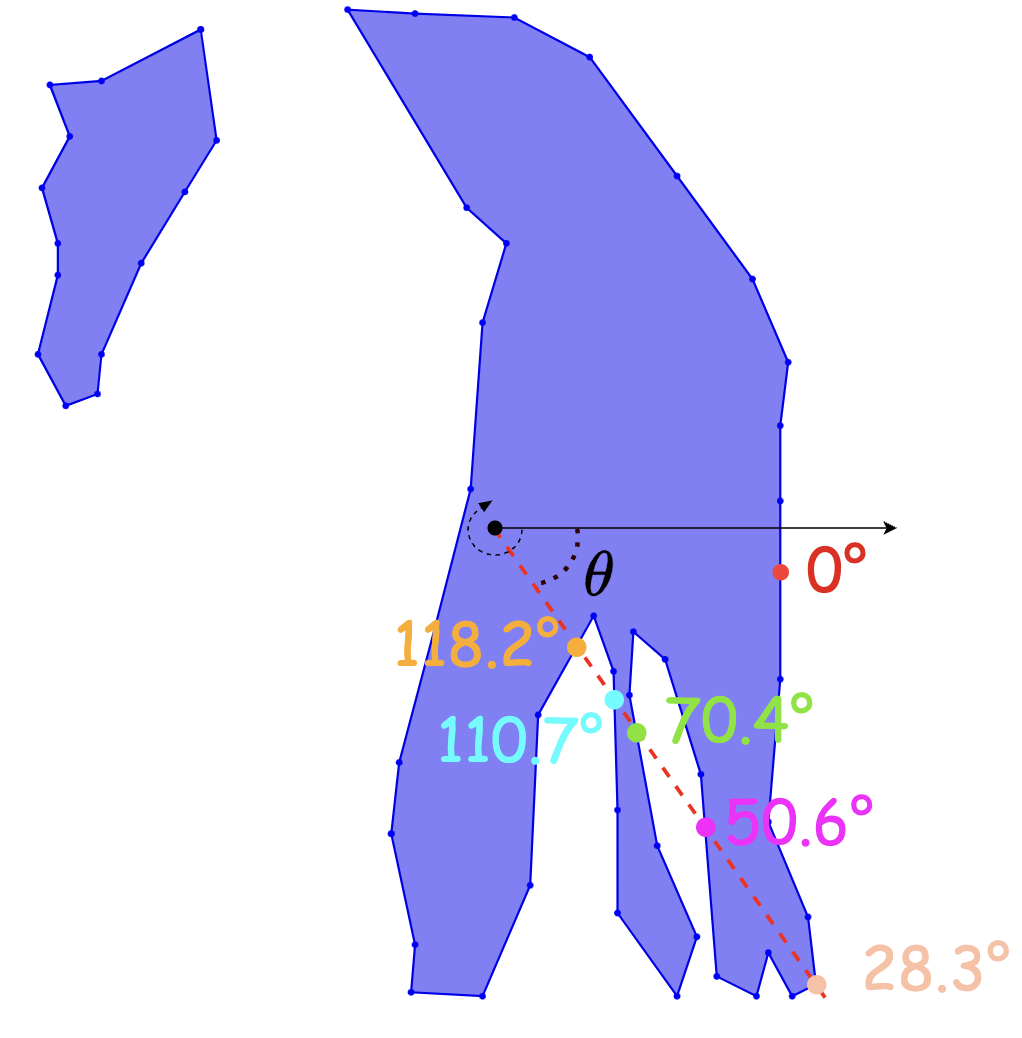Our point regression strategy exploits this property to avoid ambiguities present in Cartesian and polar systems. For example, in polar coordinates, a ray from the centroid may intersect the contour at multiple points sharing the same angle but differing in radius. In contrast, under EFD, such points are associated with distinct phase values, as illustrated in the figure below.